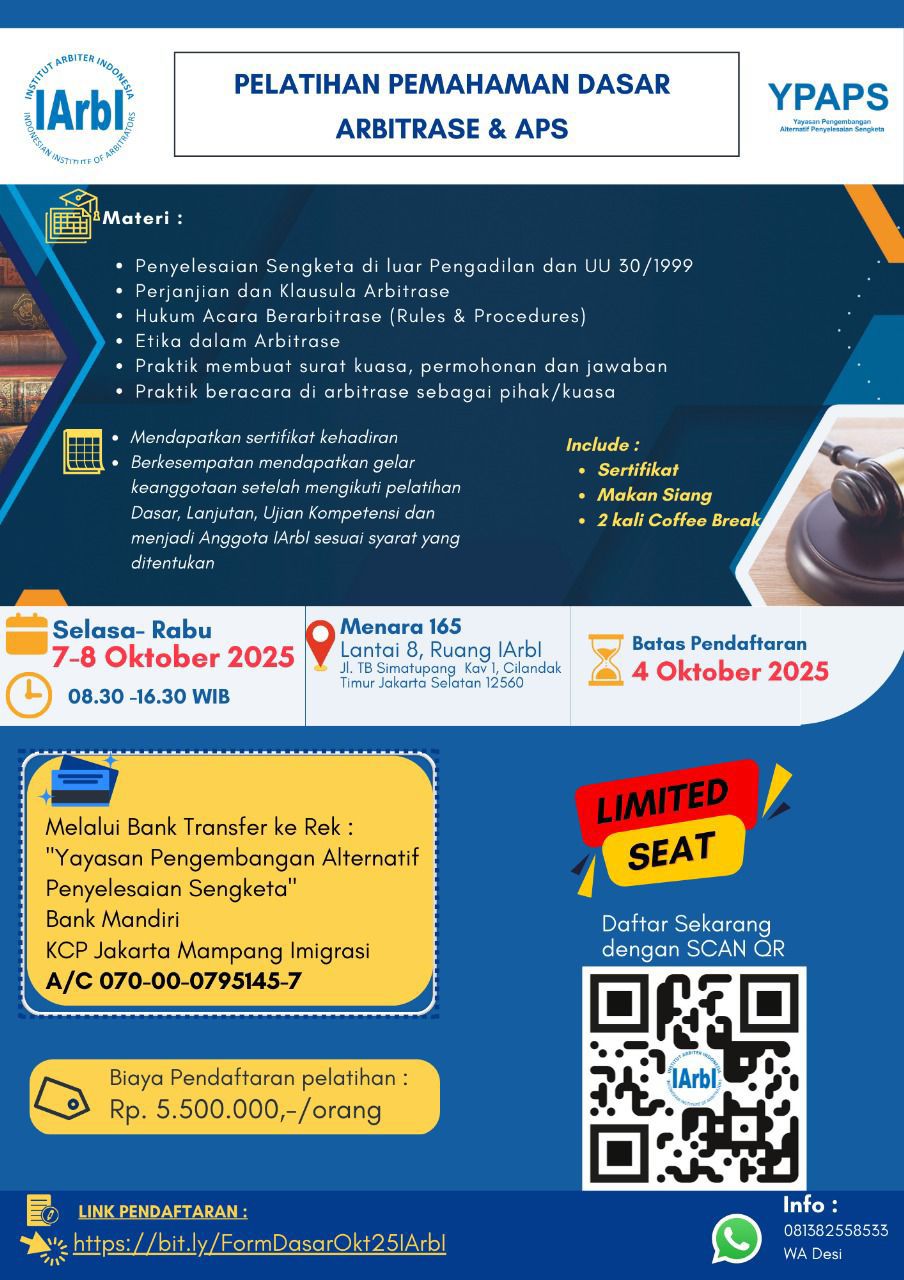 You have arrived at INSTITUT ARBITER INDONESIA (IArbI), the first and currently the only professional arbitrators organization in Indonesia.