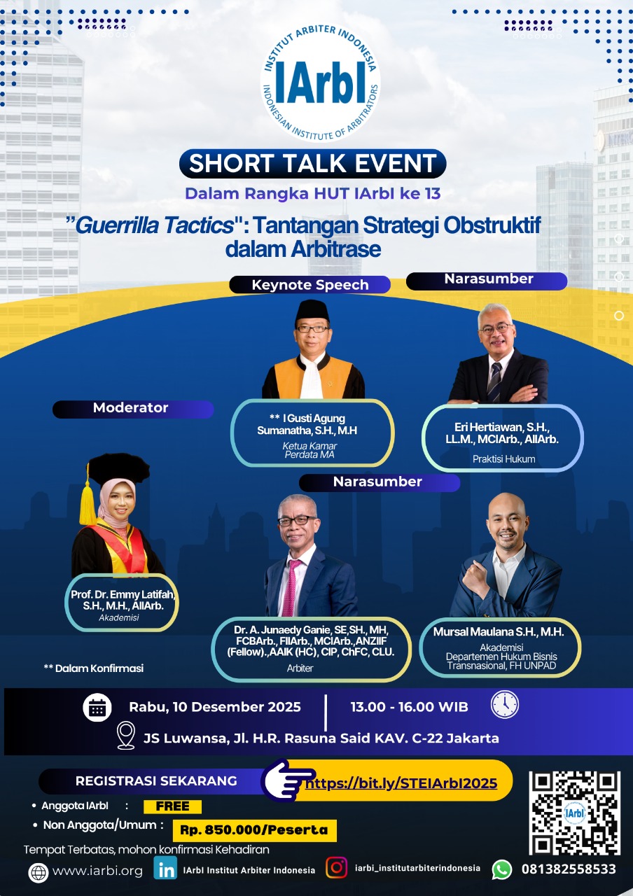 Established in December 2012, IArbI is aimed to provide a professional structure for arbitrators both Indonesian or foreign, to facilitate global networking with other professional organizations worldwide, and to act as the base organization for its members in their efforts in improving their skills and global professional network.