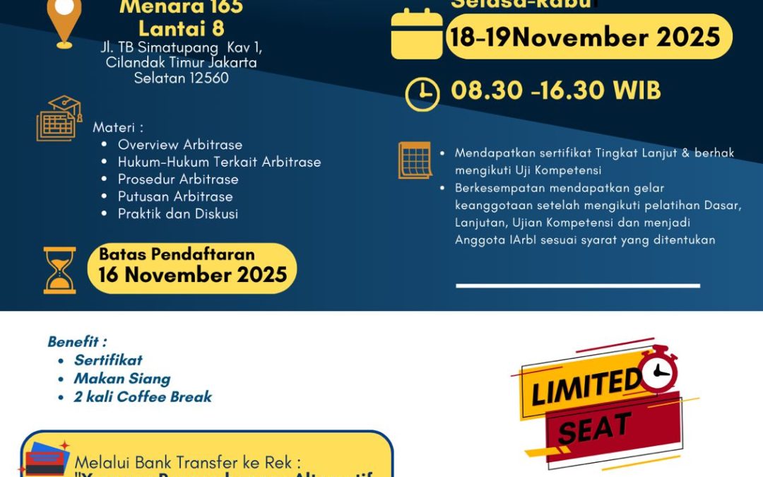Sebagai kesinambungan atas pelatihan “Pemahaman Dasar Arbitrase dan APS”, IArbI/YPAPS akan menyelenggarakan “Pelatihan Tingkat Lanjut Arbitrase/ APS”. Pelatihan ini ditujukan khusus bagi peserta yang telah mengikuti dan memiliki sertifikat “Pemahaman Dasar Arbitrase dan APS” yang diselenggarakan oleh IArbI /YPAPS.